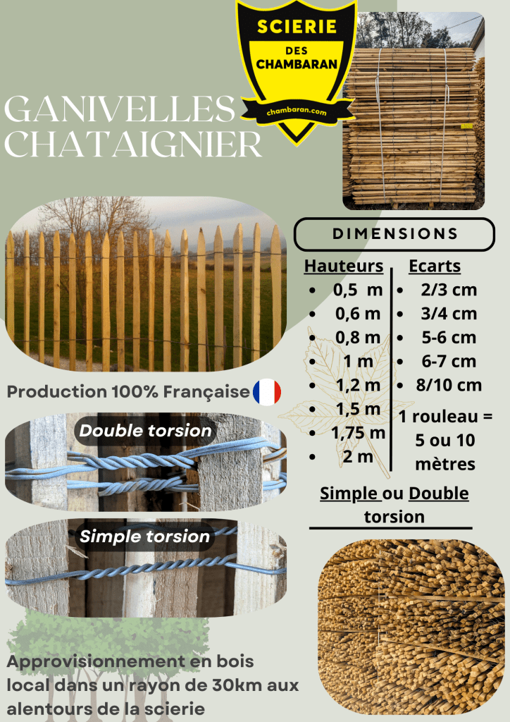 Nous proposons de la ganivelle sciée à la volée de châtaignier (Castanea sativa) aux caractéristiques et dimensions variées. Produit naturel, durable dans le temps, offrant une grande simplicité d’utilisation et une mise en œuvre rapide.