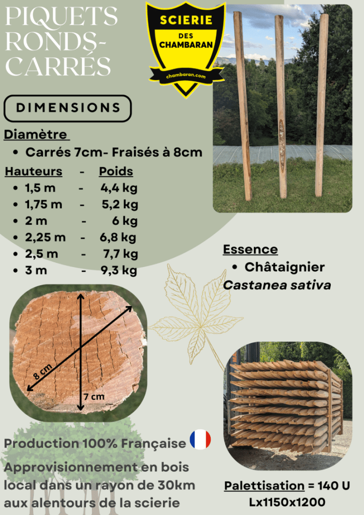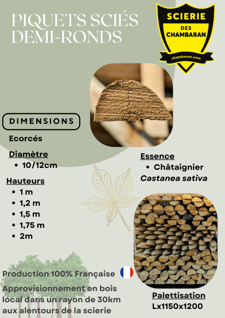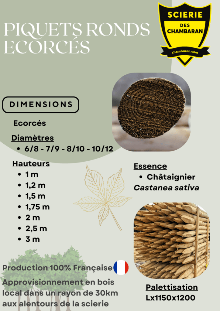 Essences : Châtaignier (Castanea sativa) ou acacia (Robinia pseudoacacia).